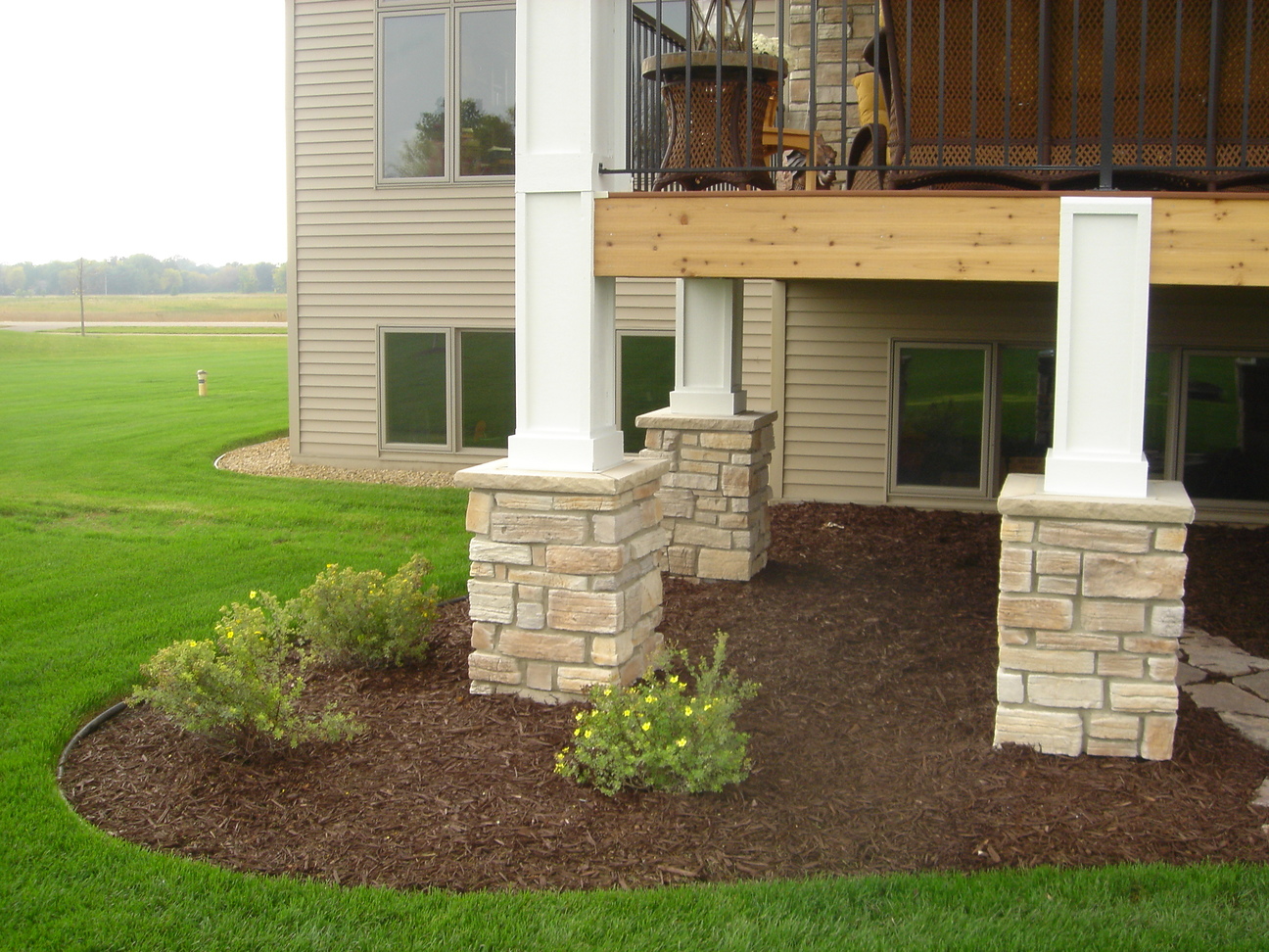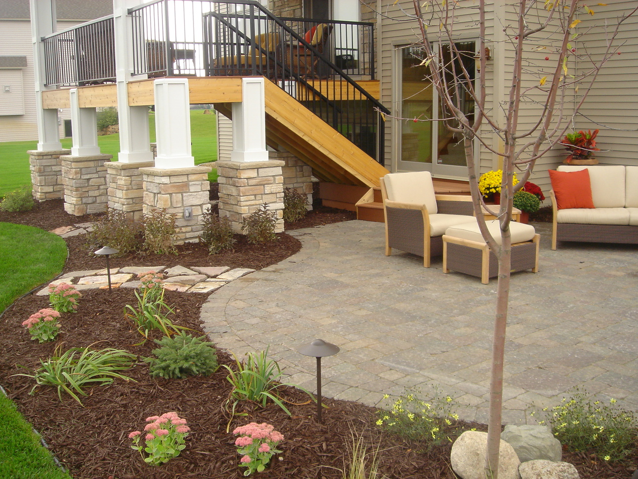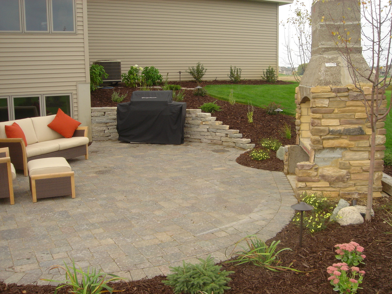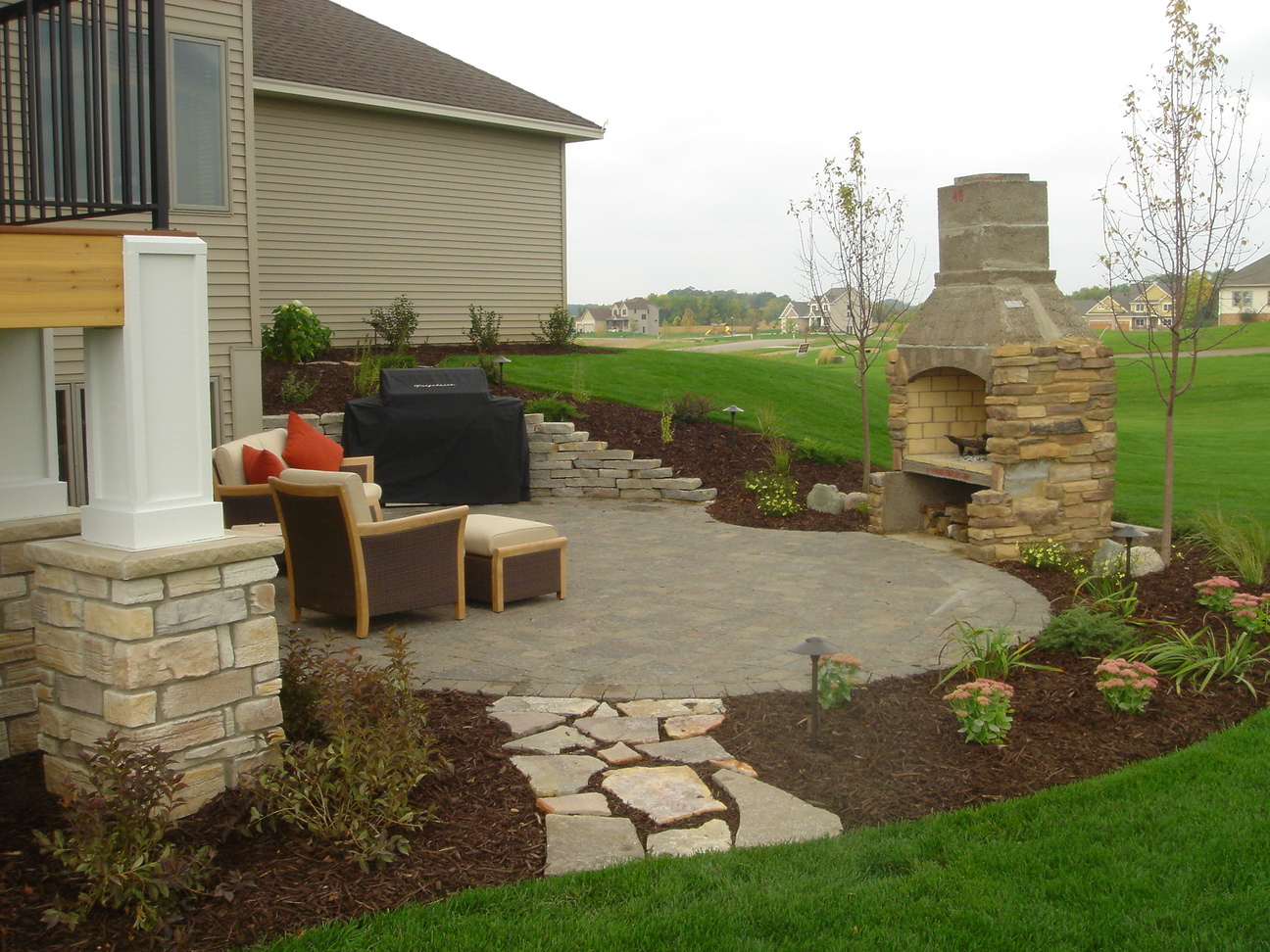 Custom landscape and hardscape design on this project in Corcoran, MN included an Anchor Tumbled Charleston paver patio, a Chilton stone retaining wall and a 48″ outdoor fireplace with custom cultured stone that matched the stone wraps on the screen porch. All of the hardscapes stood out with the colorful Crabapple trees and perennials, it was all brought together with a dark coco brown dyed mulch. Custom screened porch with retractable screens, cedar tongue and groove ceiling and matching stone accent wall.