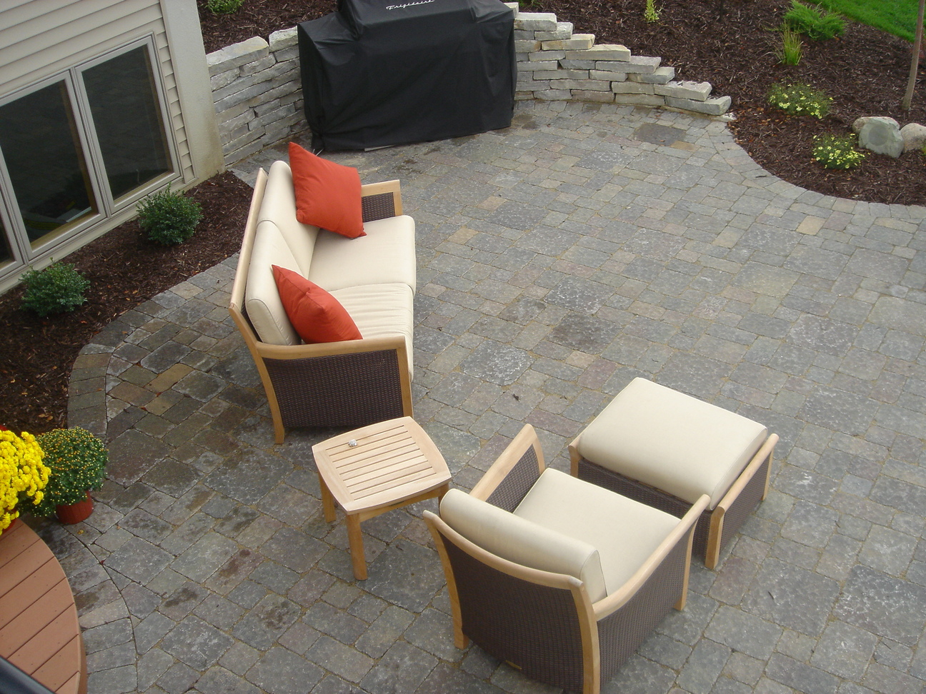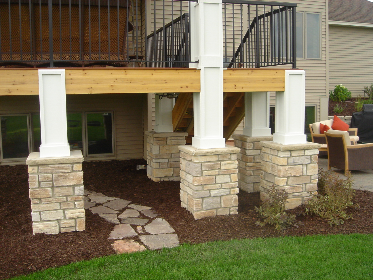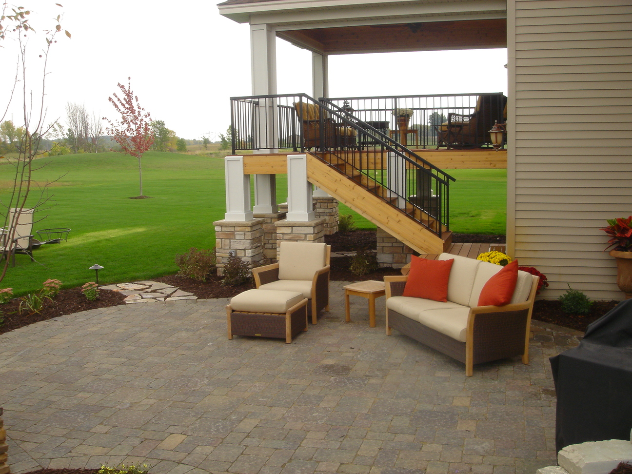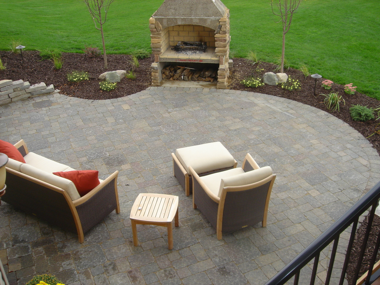 Custom landscape and hardscape design on this project in Corcoran, MN included an Anchor Tumbled Charleston paver patio, a Chilton stone retaining wall and a 48″ outdoor fireplace with custom cultured stone that matched the stone wraps on the screen porch. All of the hardscapes stood out with the colorful Crabapple trees and perennials, it was all brought together with a dark coco brown dyed mulch. Custom screened porch with retractable screens, cedar tongue and groove ceiling and matching stone accent wall.