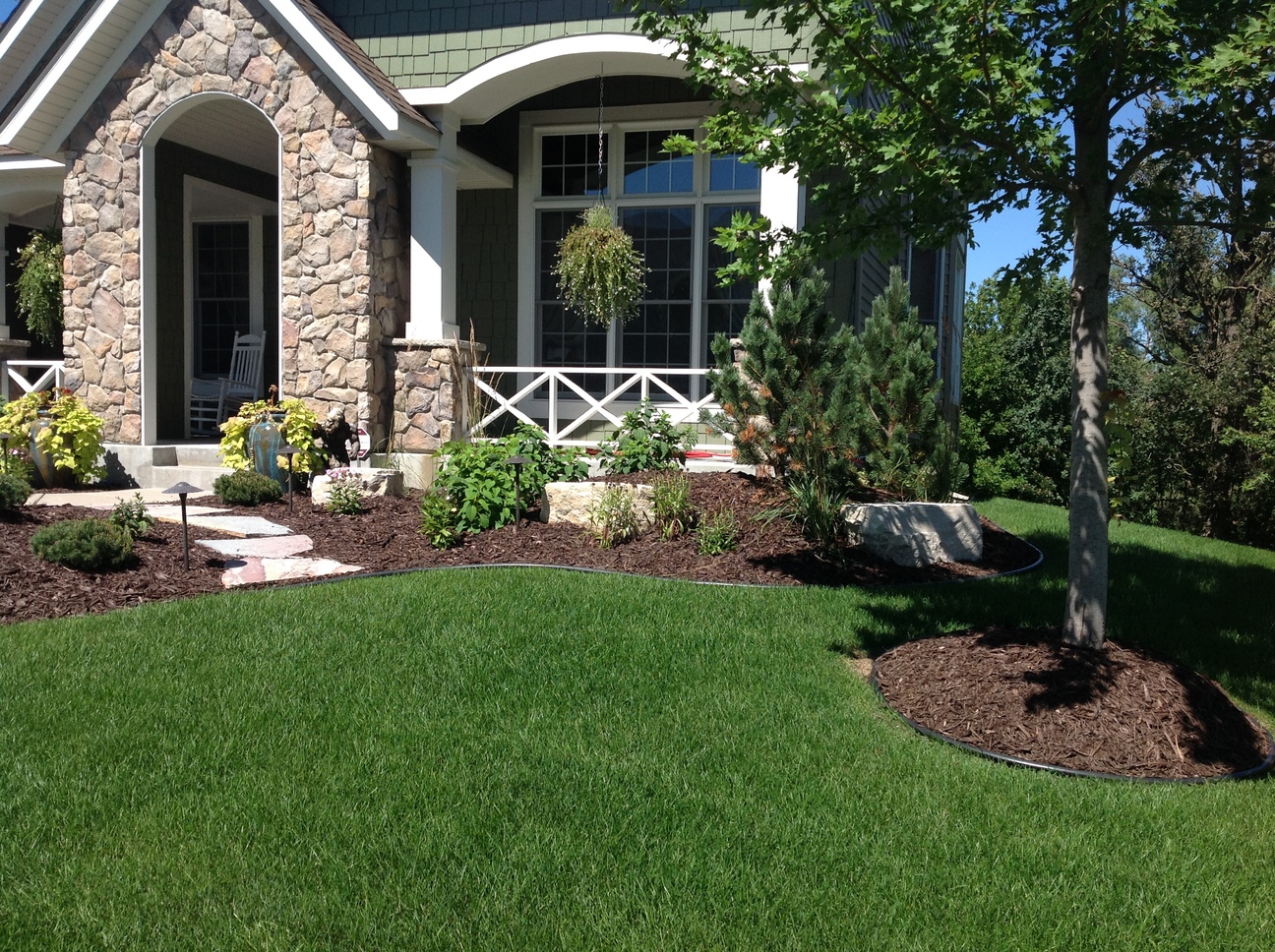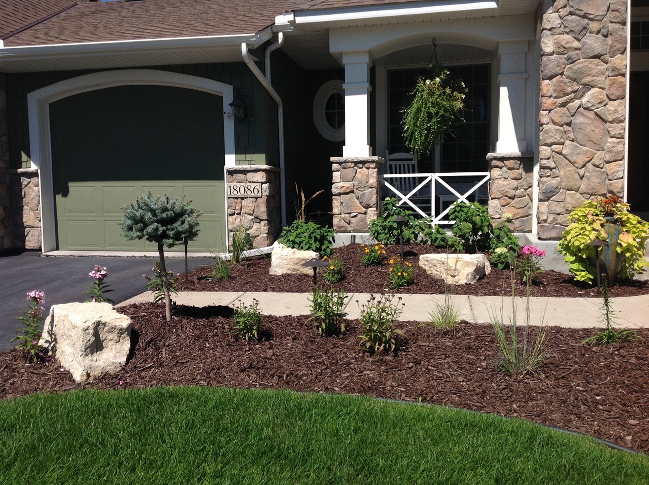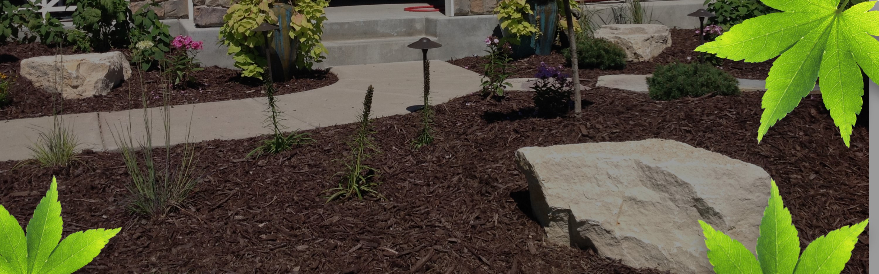 Limestone Outcroppings, Brown Mulch, and a variety of plants