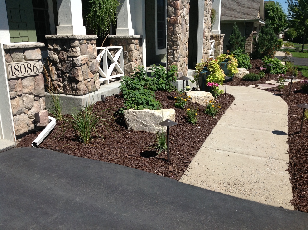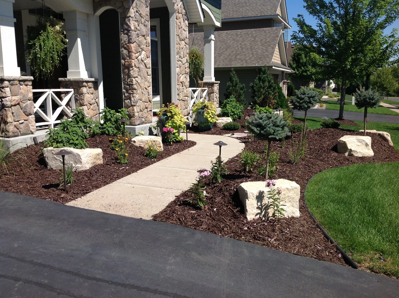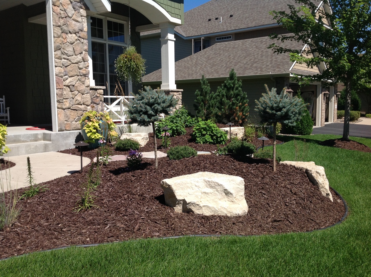 This custom landscape project in Maple Grove, MN used many different varieties of plant material to provide year round color. The evergreens were brought in to add some height as well as winter interest. The light colored limestone cube outcroppings provide a balance of hard and soft materials. The landscape really showcases at night with the spot lights that shine up on the stone columns and the down lights that accent the sidewalk and plants.