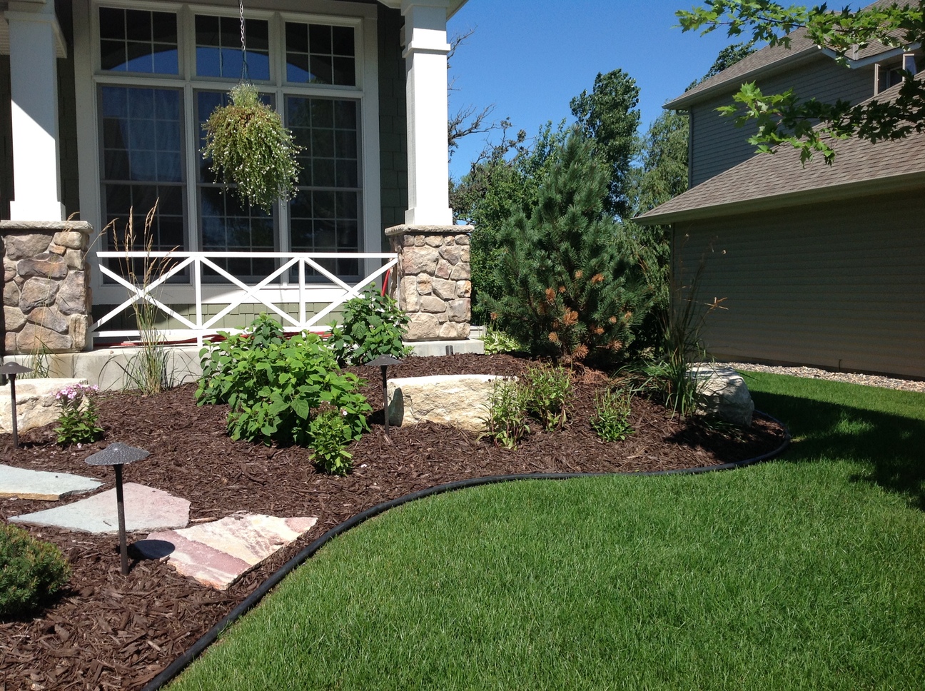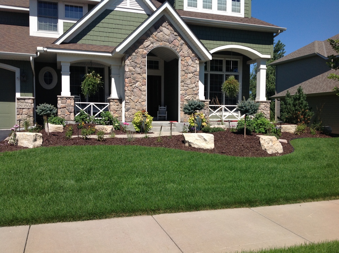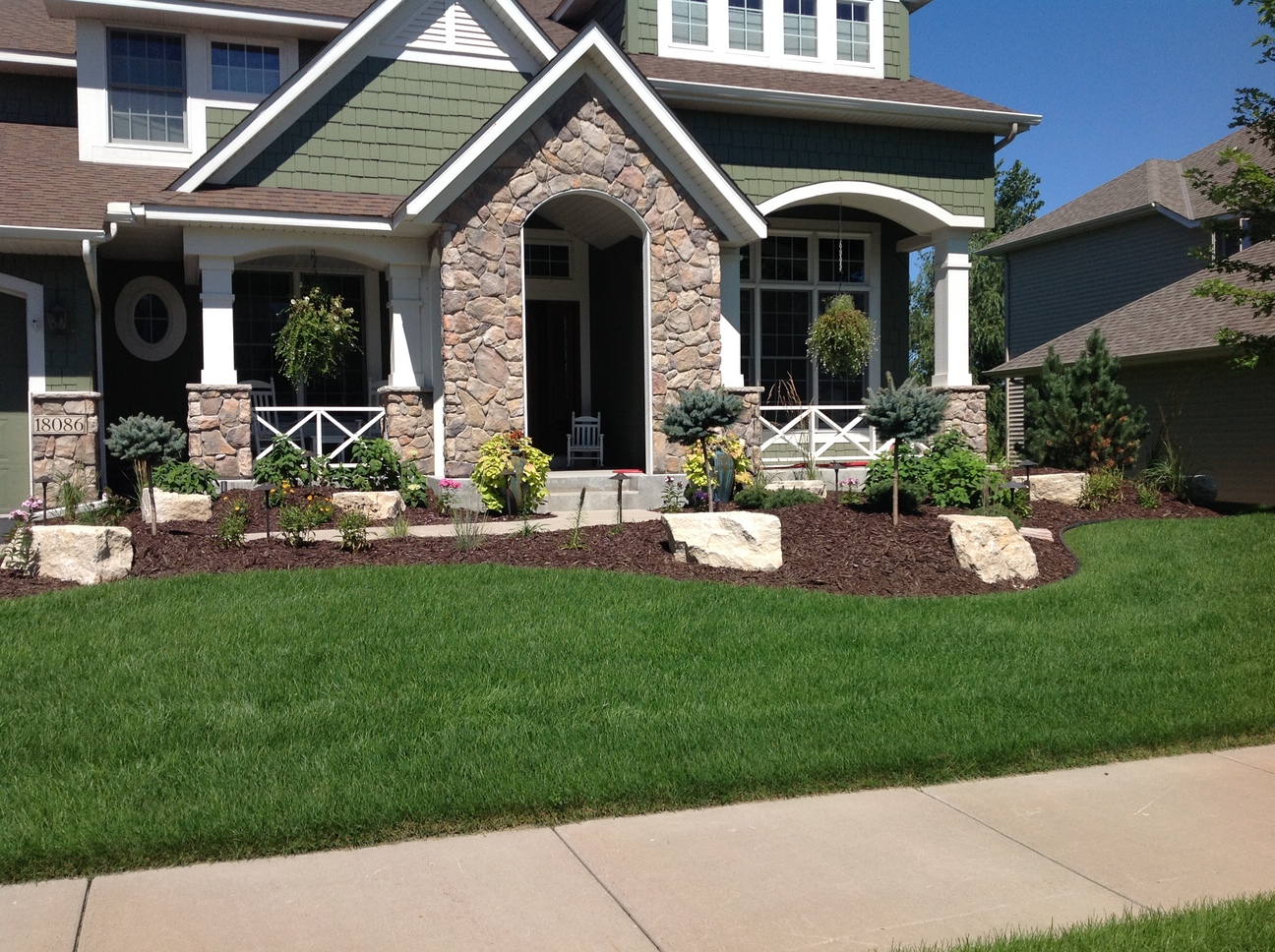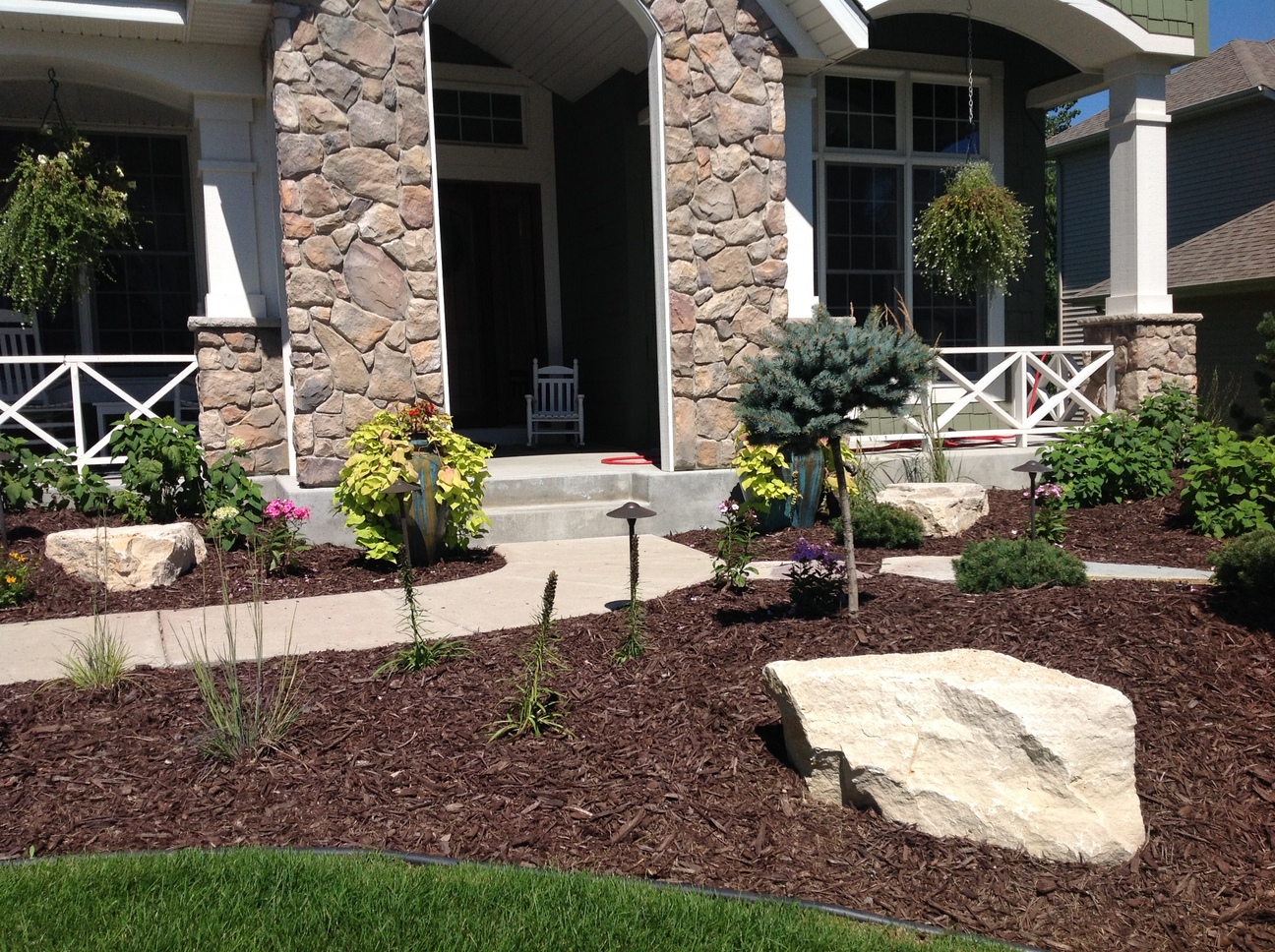 This custom landscape project in Maple Grove, MN used many different varieties of plant material to provide year round color. The evergreens were brought in to add some height as well as winter interest. The light colored limestone cube outcroppings provide a balance of hard and soft materials. The landscape really showcases at night with the spot lights that shine up on the stone columns and the down lights that accent the sidewalk and plants.