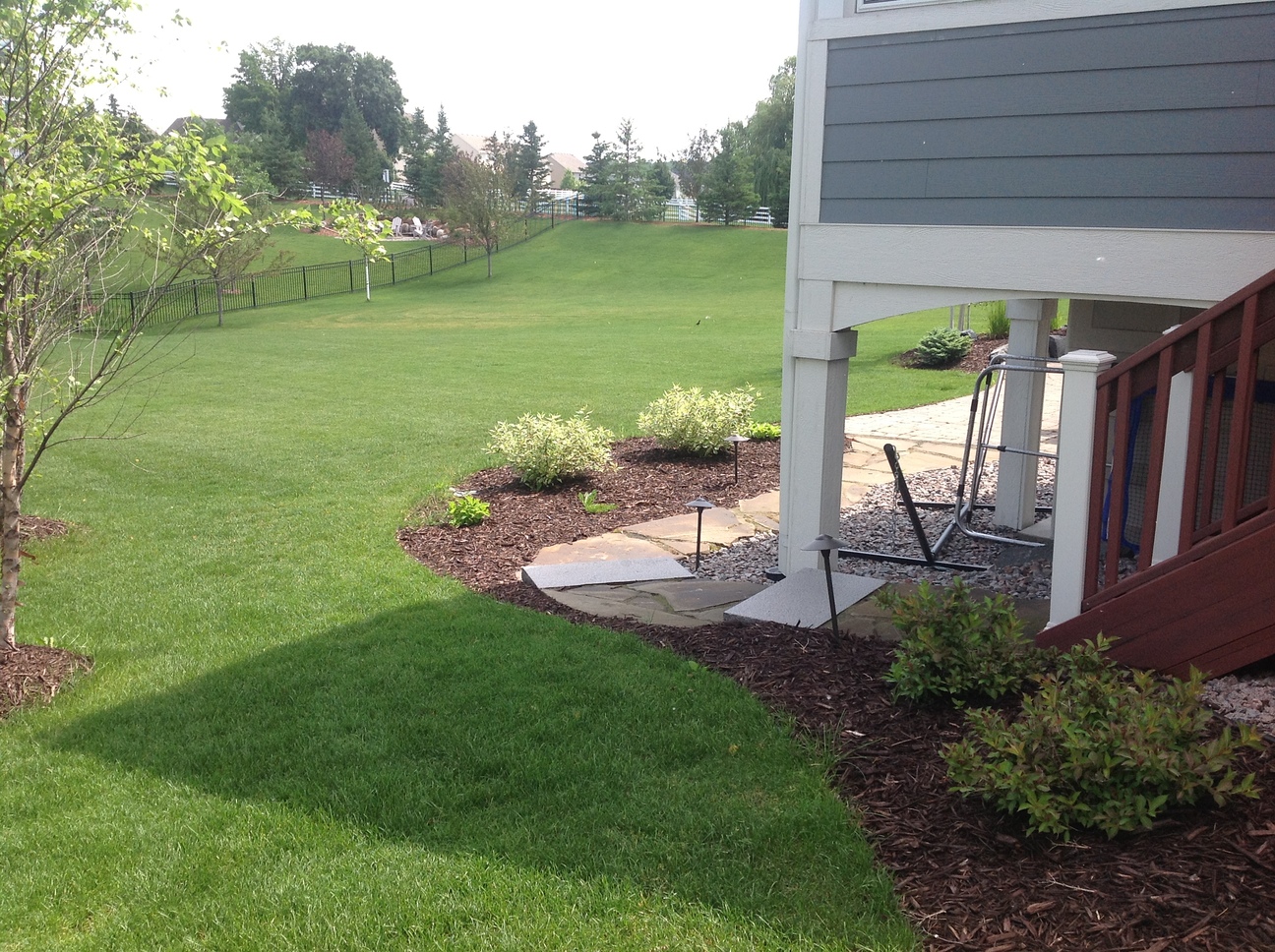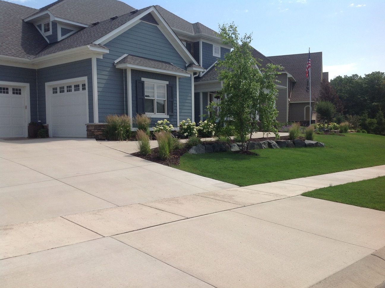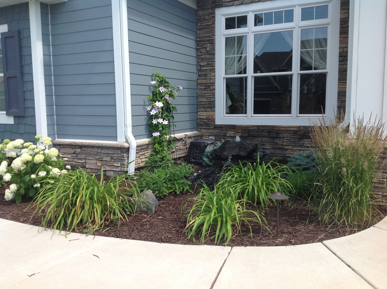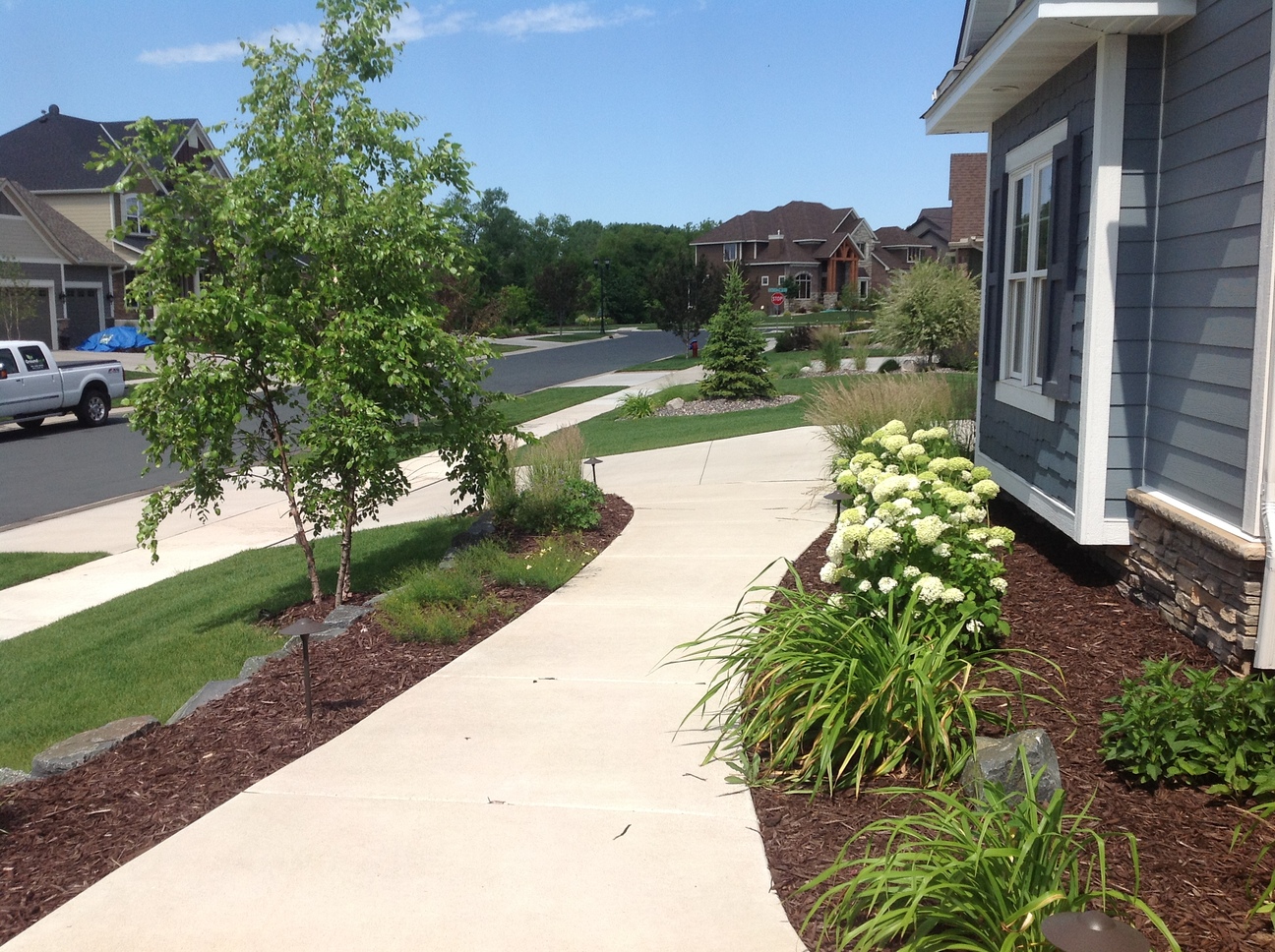 This custom landscape and hardscape project in Maple Grove, MN features an Anchor paver patio, a Bluestone stepper pathway, Granite steps, and a bubbling rock water feature. The plant material offers year round interest as well as a balance of heights with Aspen, Crabapple, and Birch trees. The dark gray trap boulder walls and flowering Hydrangea plants offer a nice color contrast to the house.