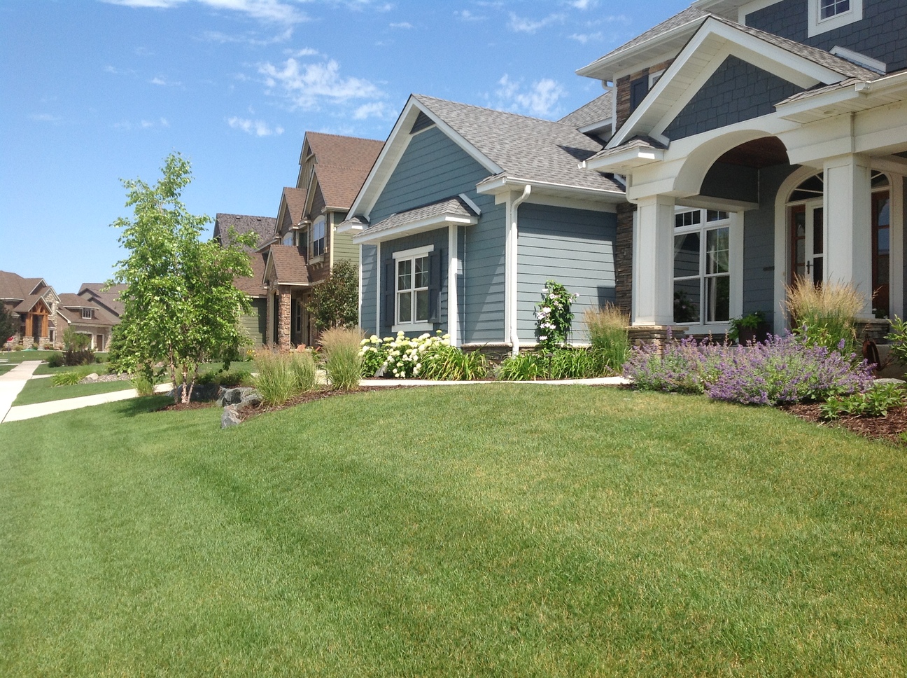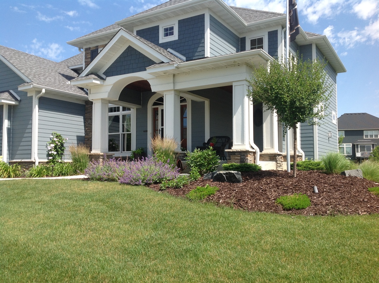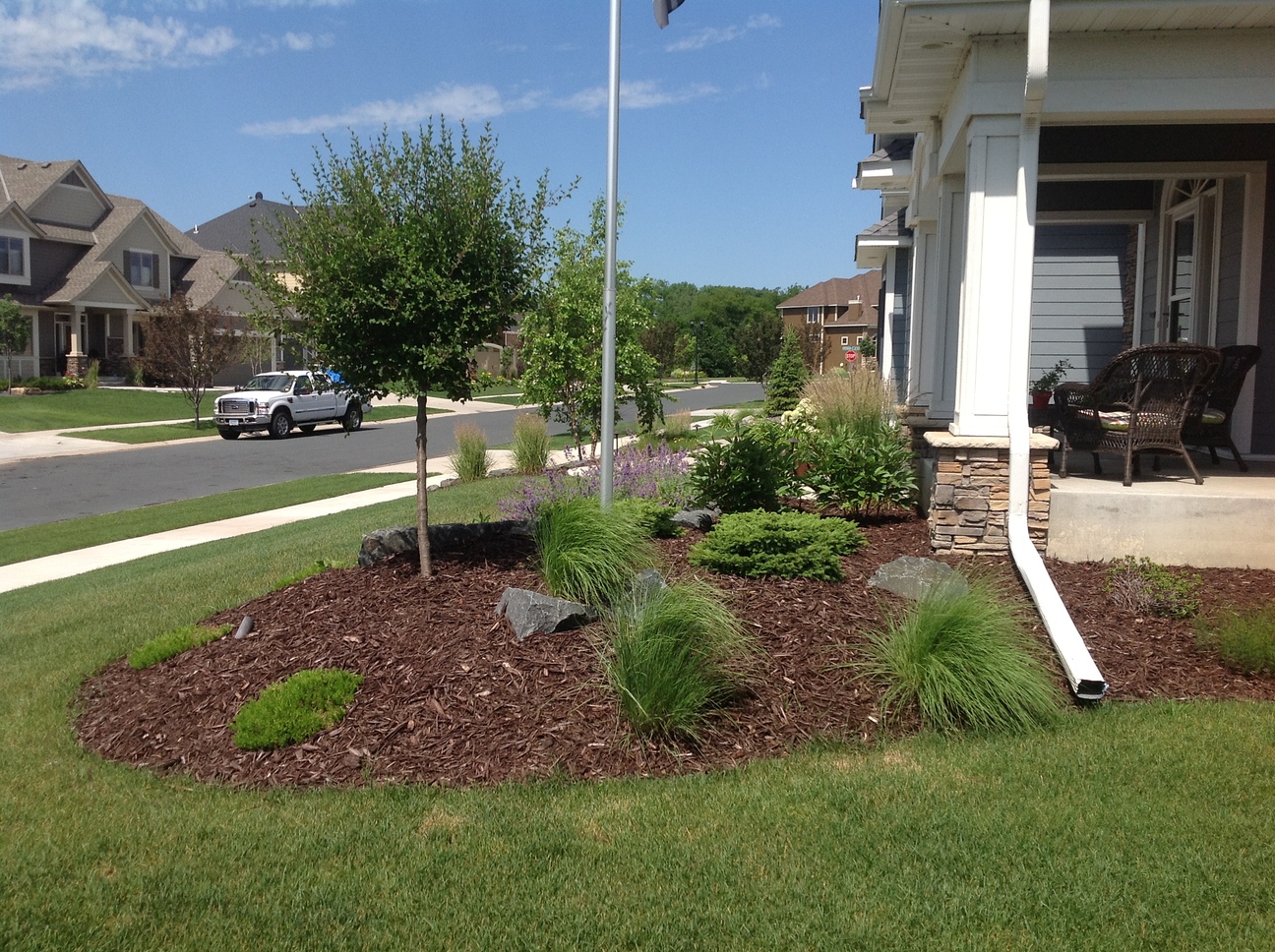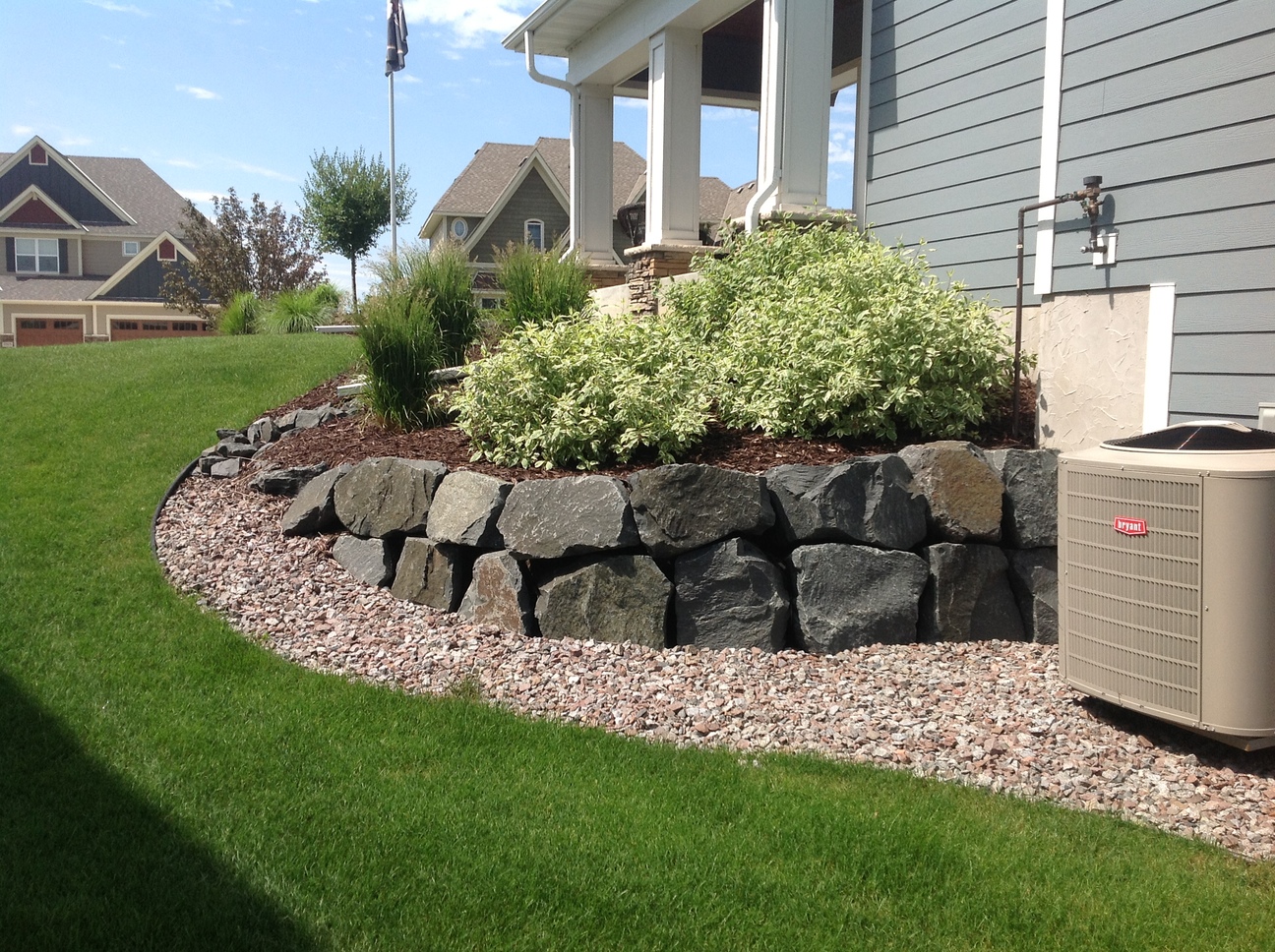 This custom landscape and hardscape project in Maple Grove, MN features an Anchor paver patio, a Bluestone stepper pathway, Granite steps, and a bubbling rock water feature. The plant material offers year round interest as well as a balance of heights with Aspen, Crabapple, and Birch trees. The dark gray trap boulder walls and flowering Hydrangea plants offer a nice color contrast to the house.