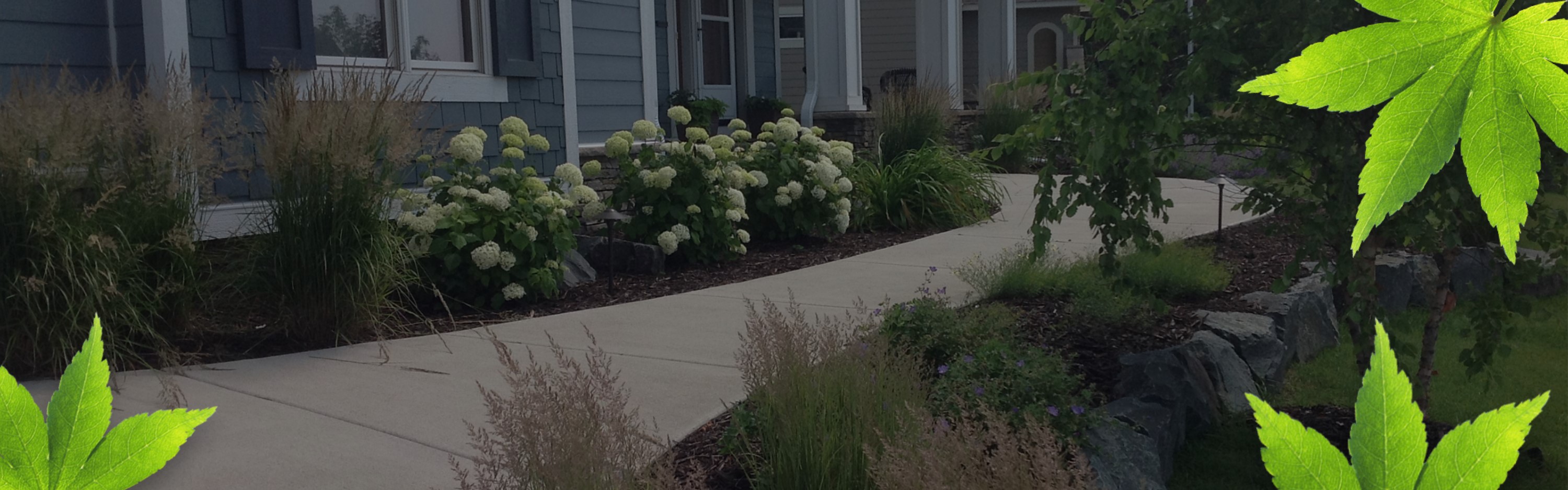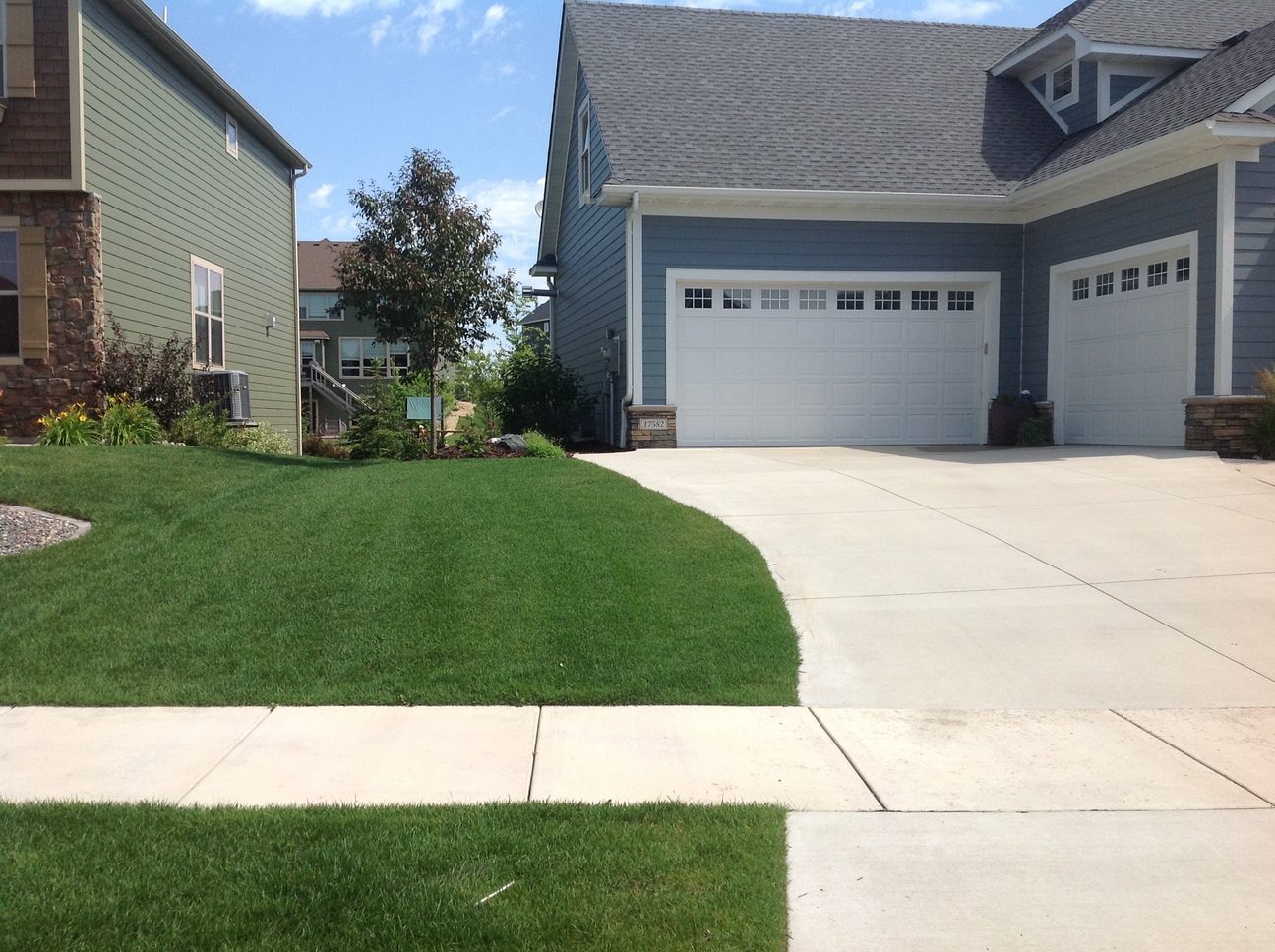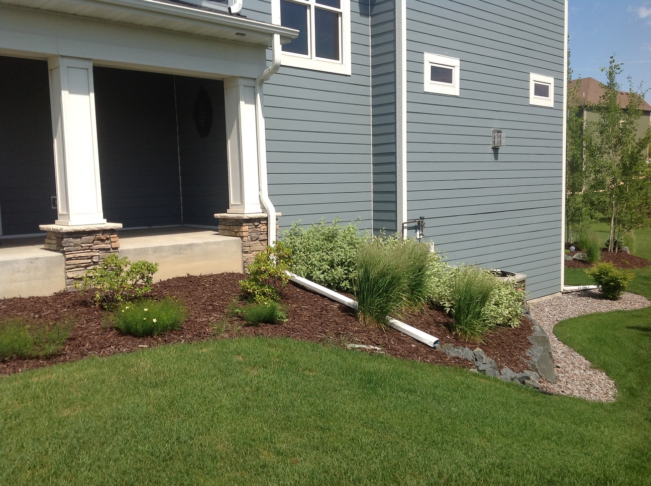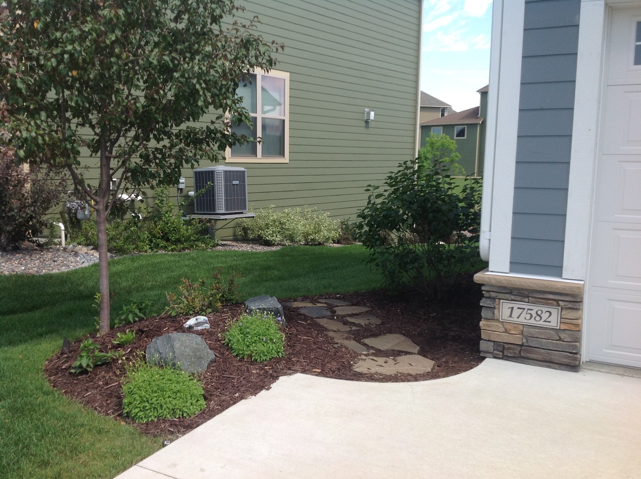 This custom landscape and hardscape project in Maple Grove, MN features an Anchor paver patio, a Bluestone stepper pathway, Granite steps, and a bubbling rock water feature. The plant material offers year round interest as well as a balance of heights with Aspen, Crabapple, and Birch trees. The dark gray trap boulder walls and flowering Hydrangea plants offer a nice color contrast to the house.