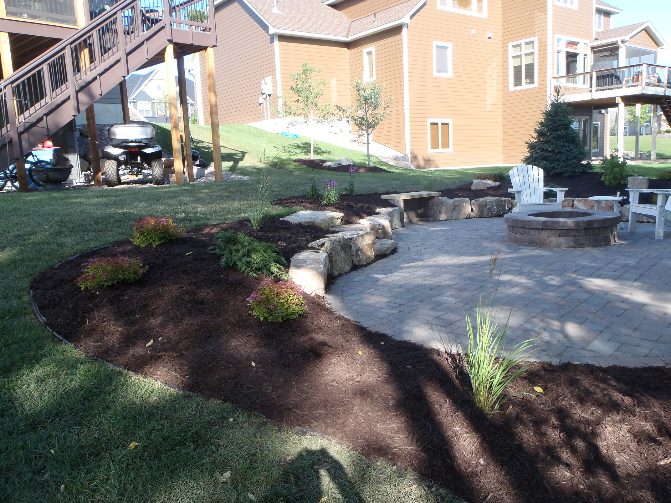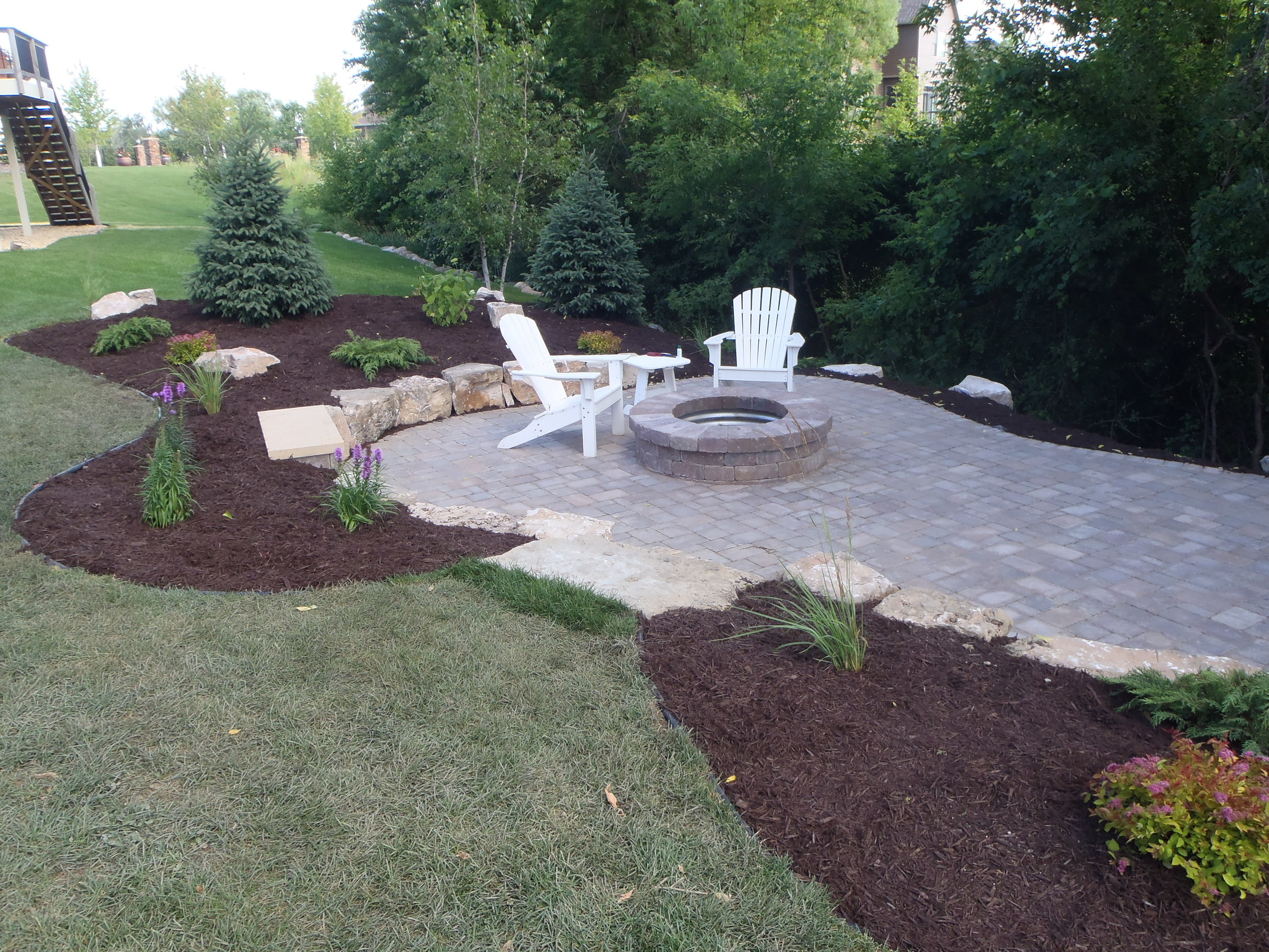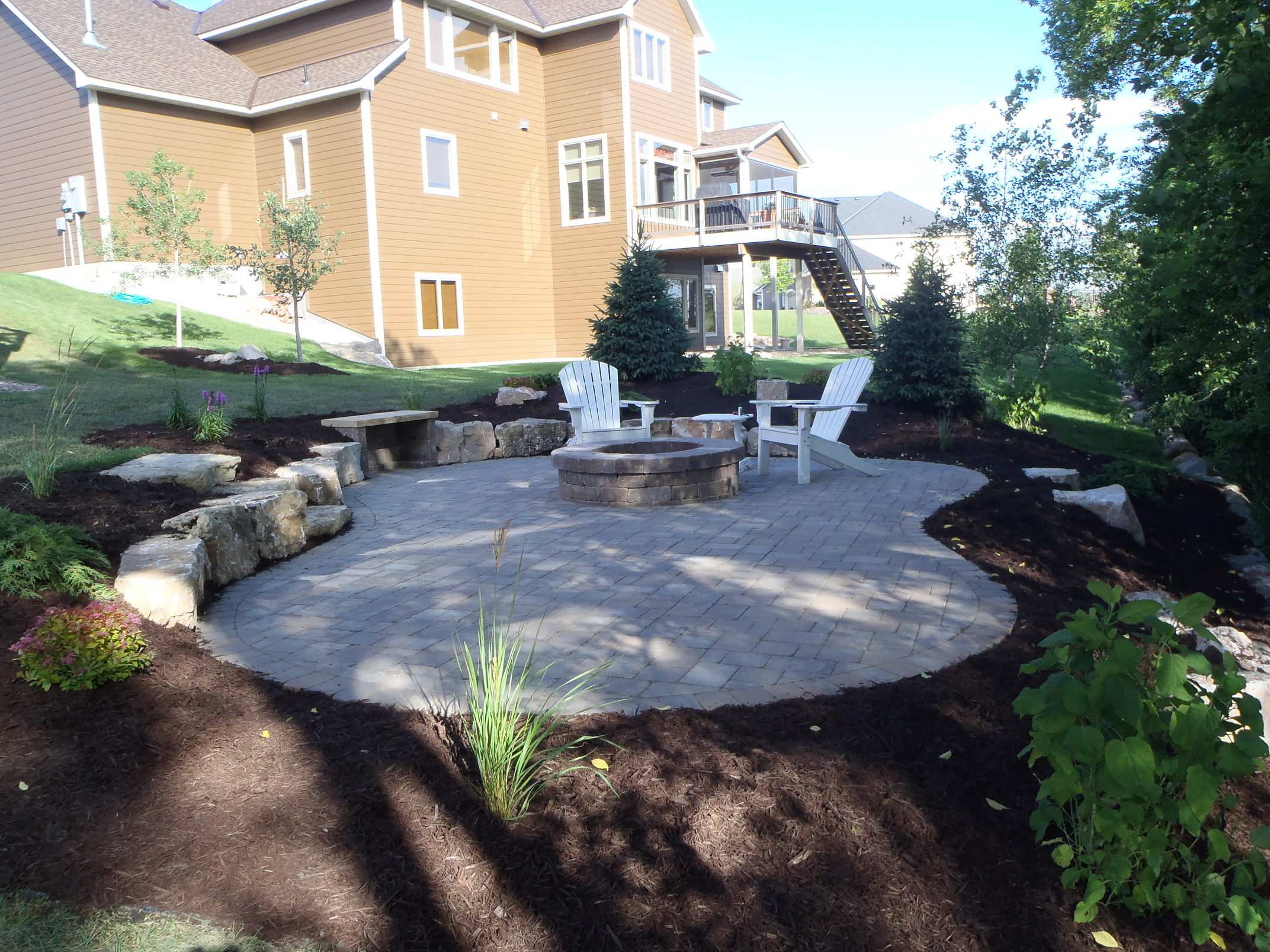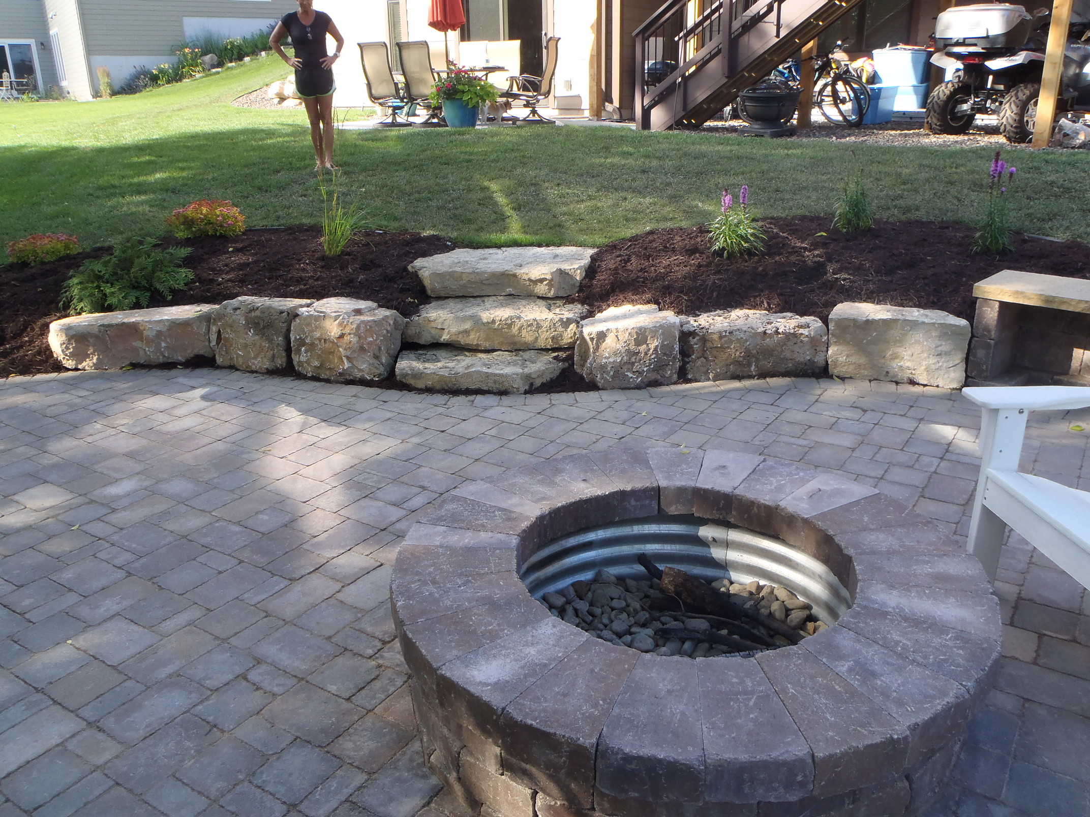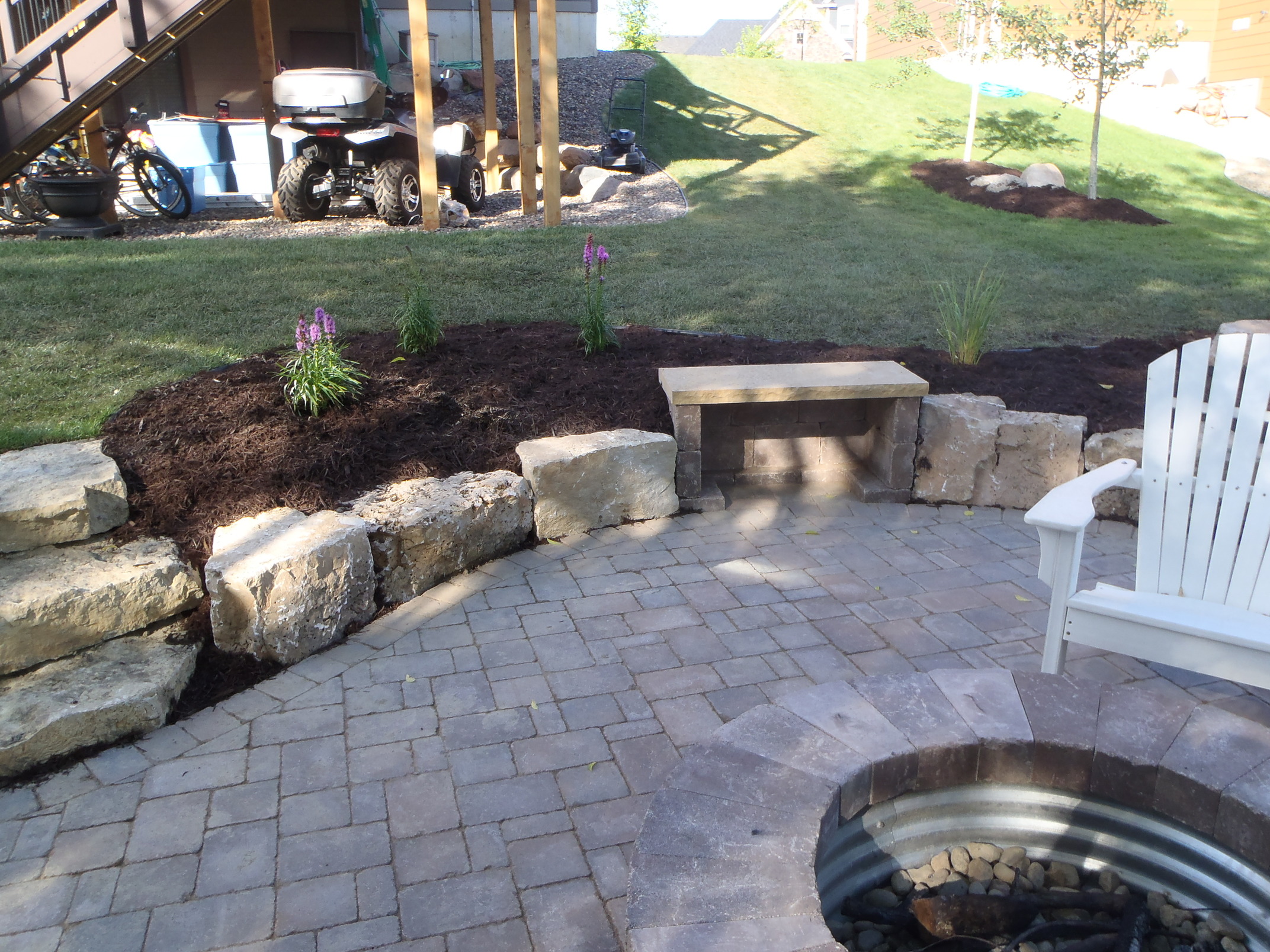 This custom fire pit in Maple Grove, MN featured limestone cube retaining wall that also doubled as extra seating around the fire pit. The Borgert Cracovia pavers for the fire pit and matching wall stone used to make the wood burning fire pit. The landscape around the fire pit utilized some Black Hills Spruce to offer a nice screening from the neighbors when out enjoying a fire.