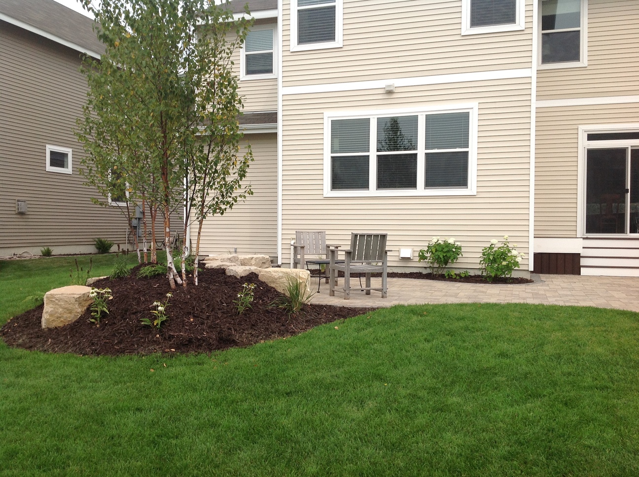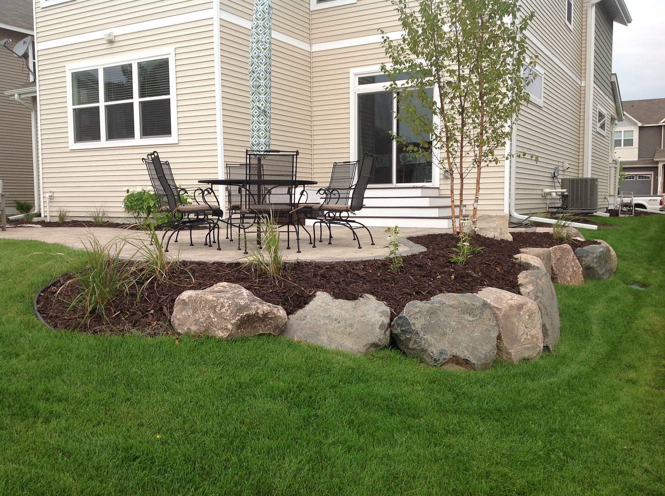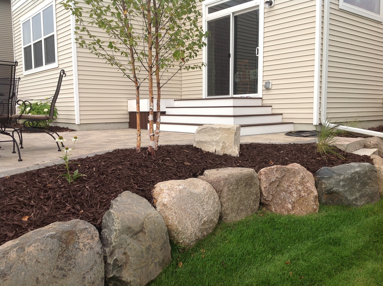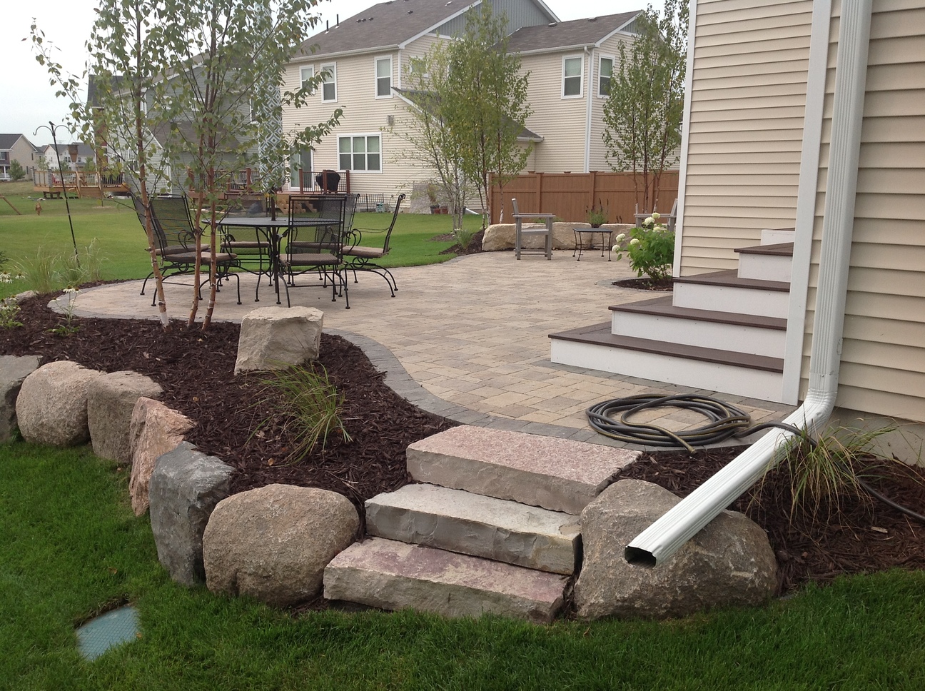 This custom landscape and hardscape project in Maple Grove, MN featured a Belgard paver patio, limestone cube seating wall, Chilton stone steps, and fieldstone boulder wall. The surrounding landscape was bermed up behind the seating wall and the River Birch clumps added some shade to the patio. The maintenance free steps and landing leading down to the patio were made with Trex decking.