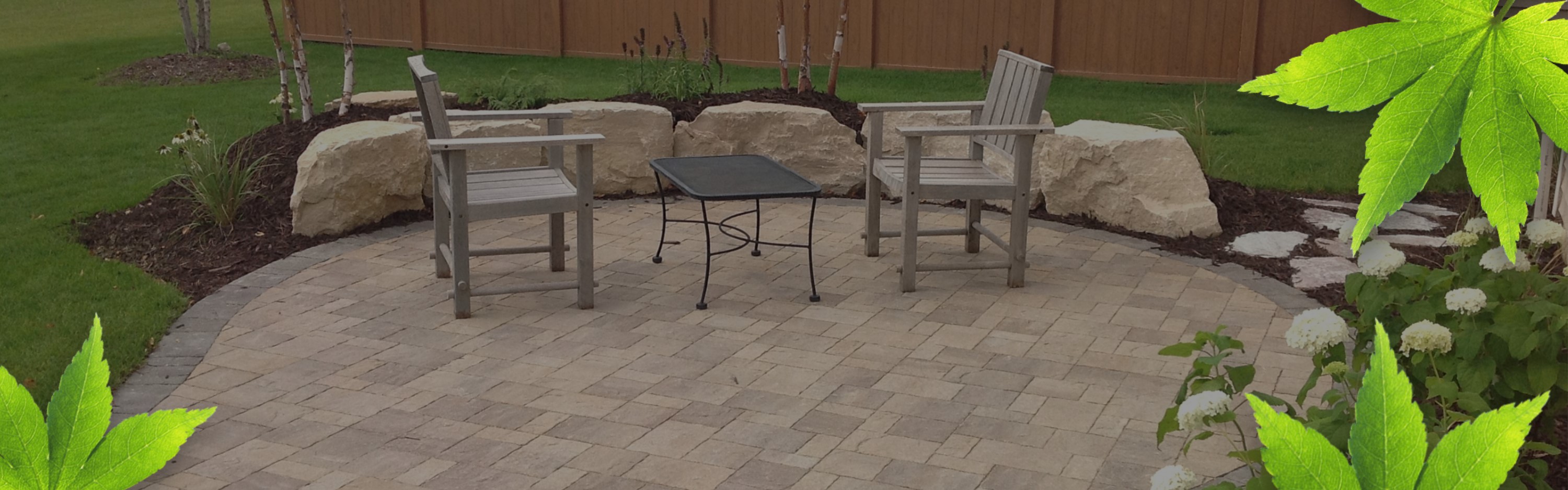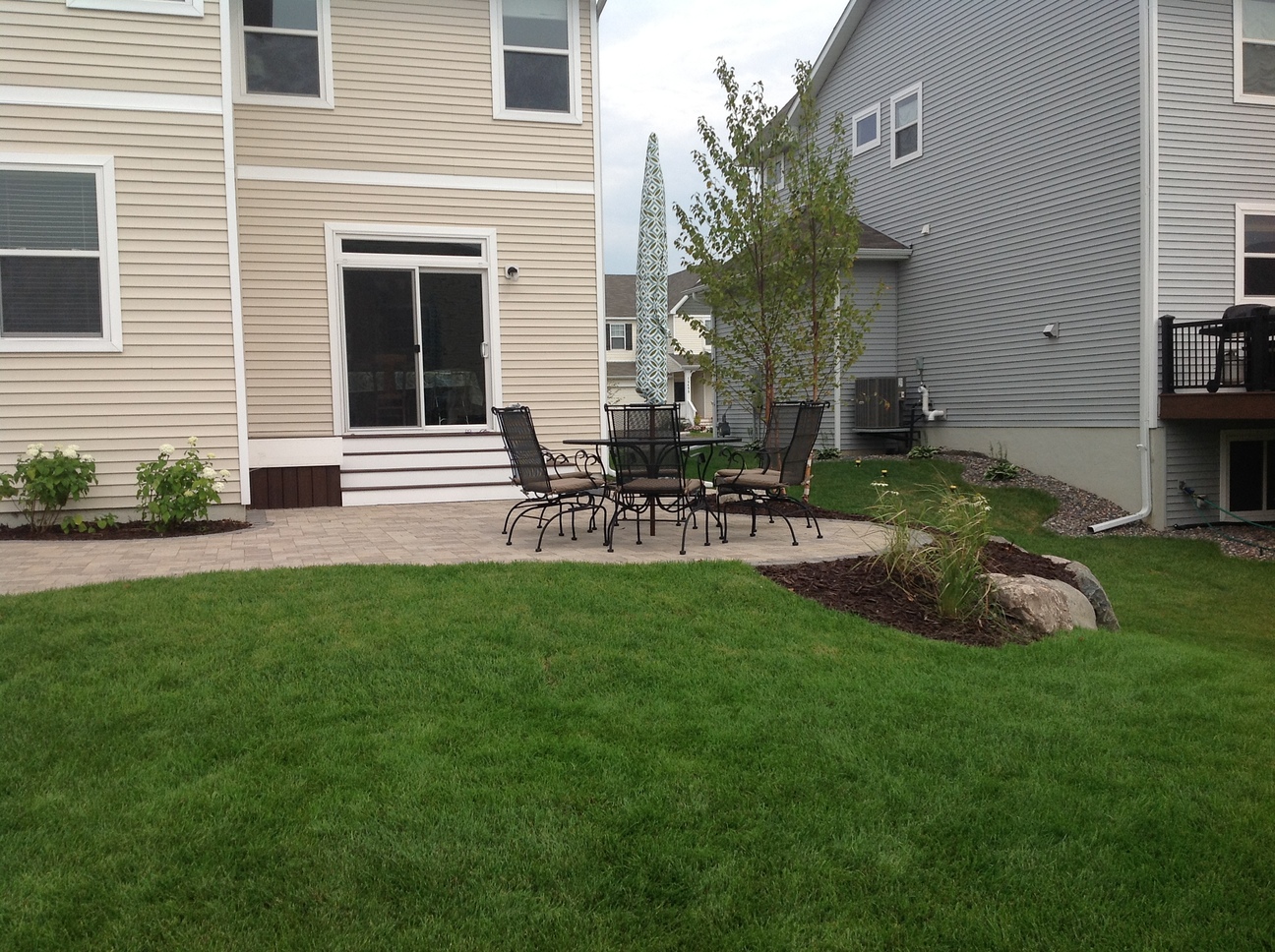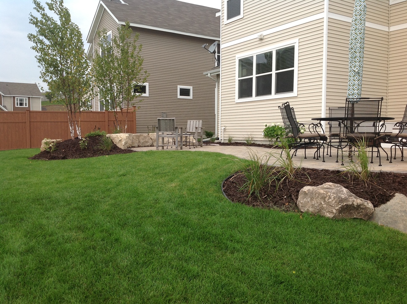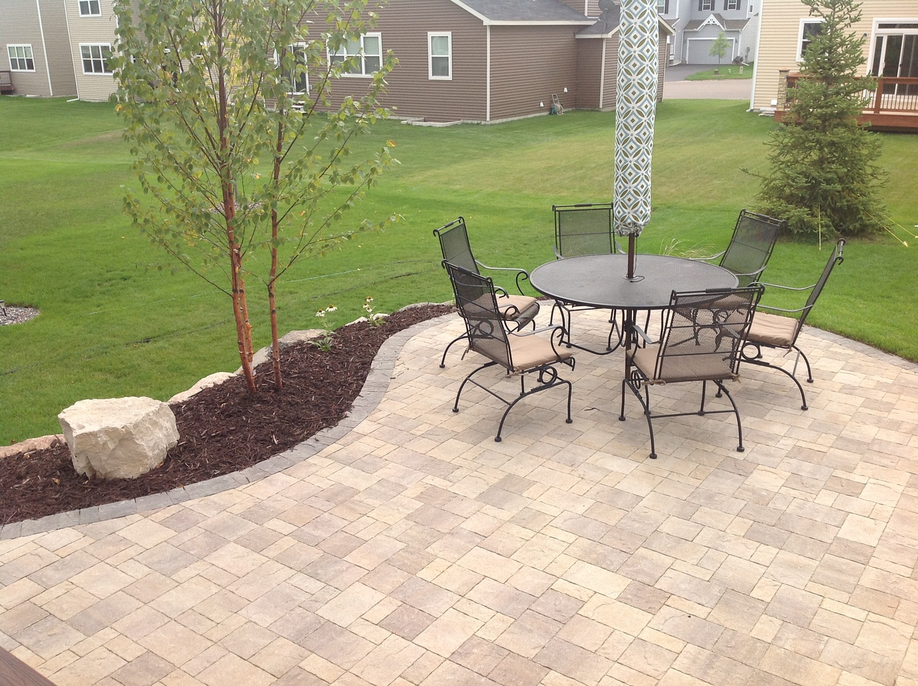 This custom landscape and hardscape project in Maple Grove, MN featured a Belgard paver patio, limestone cube seating wall, Chilton stone steps, and fieldstone boulder wall. The surrounding landscape was bermed up behind the seating wall and the River Birch clumps added some shade to the patio. The maintenance free steps and landing leading down to the patio were made with Trex decking.
