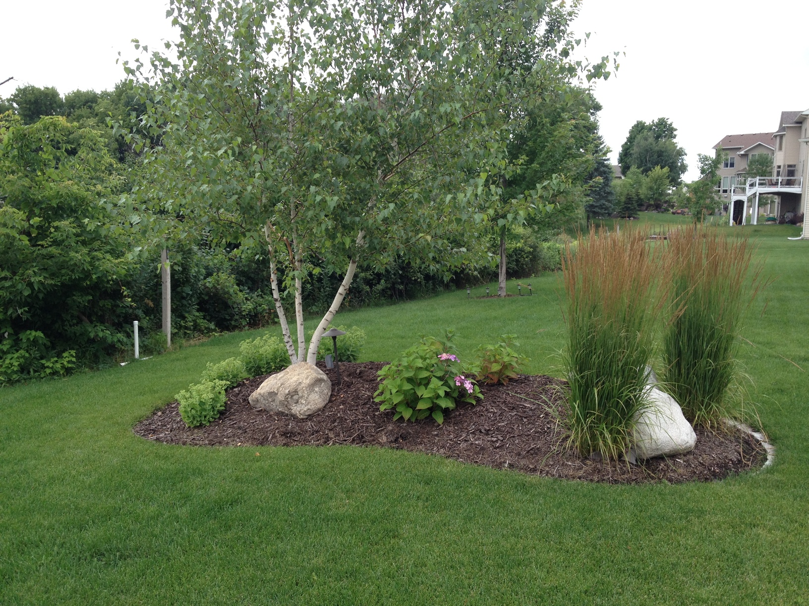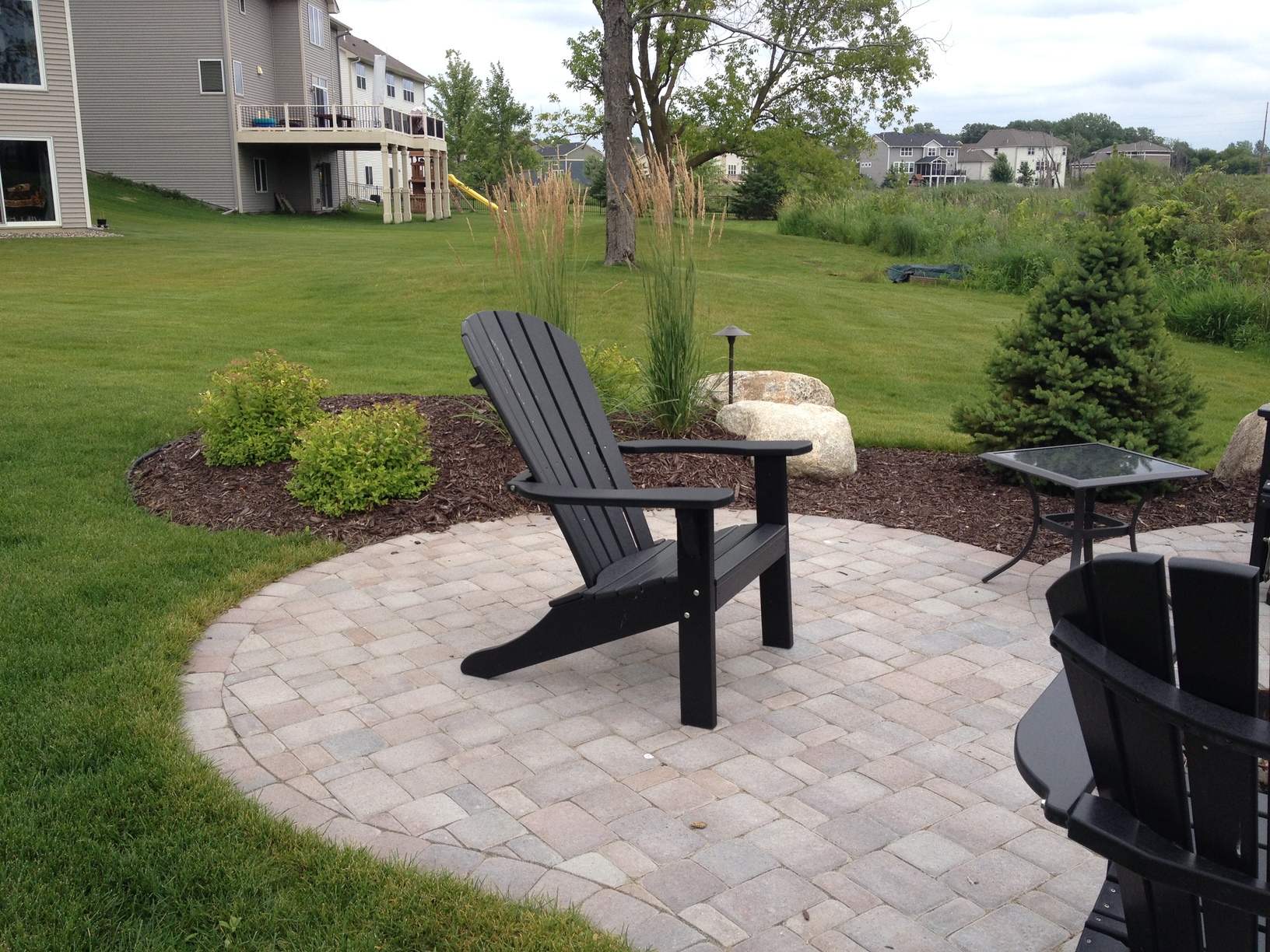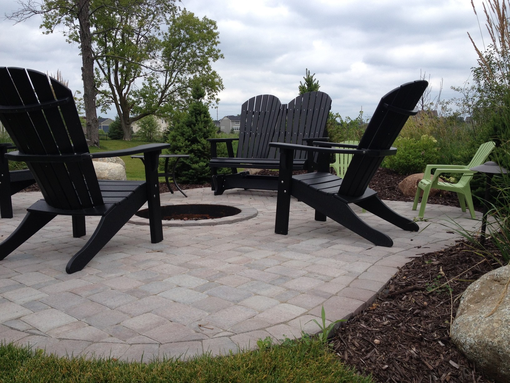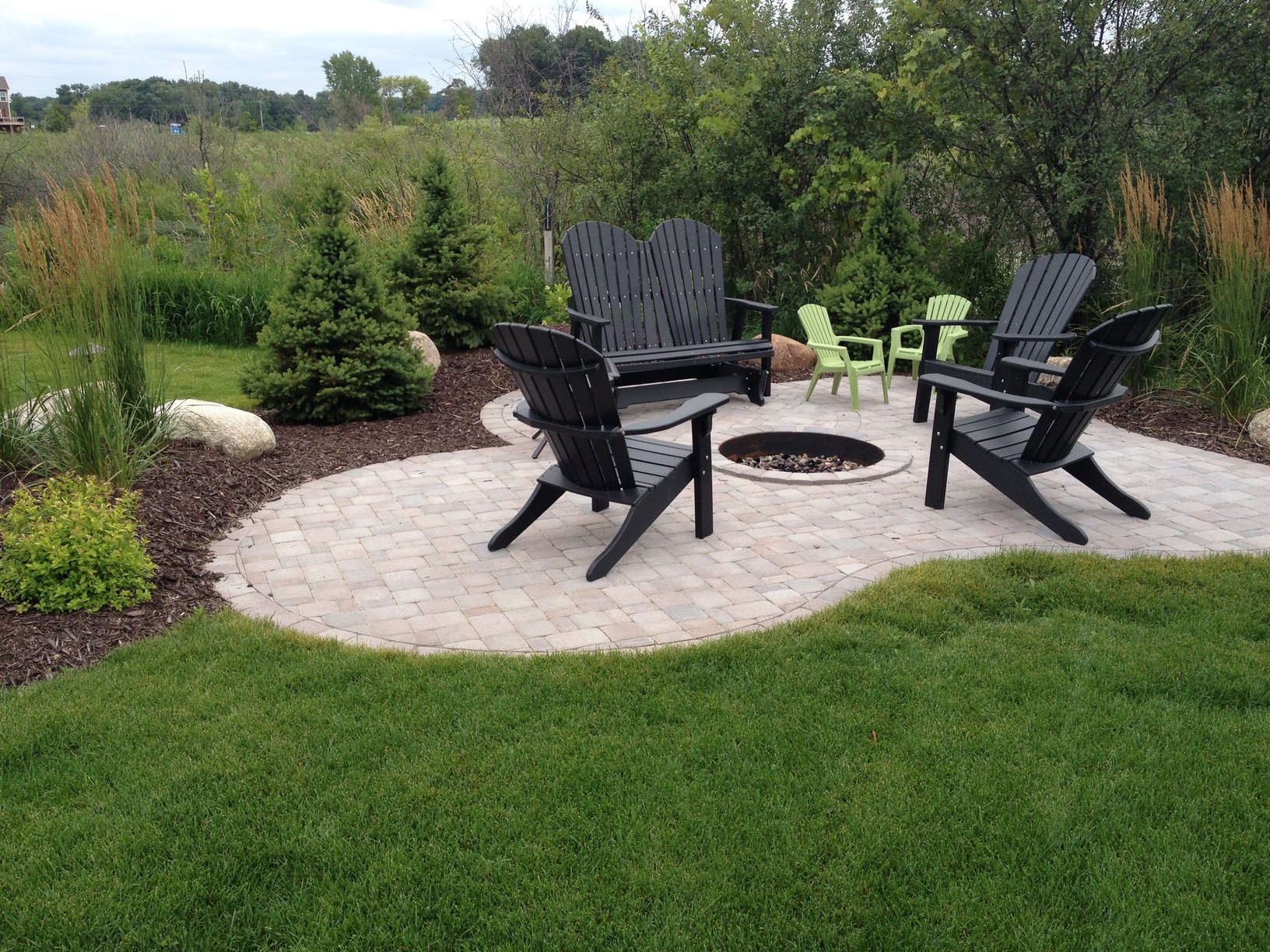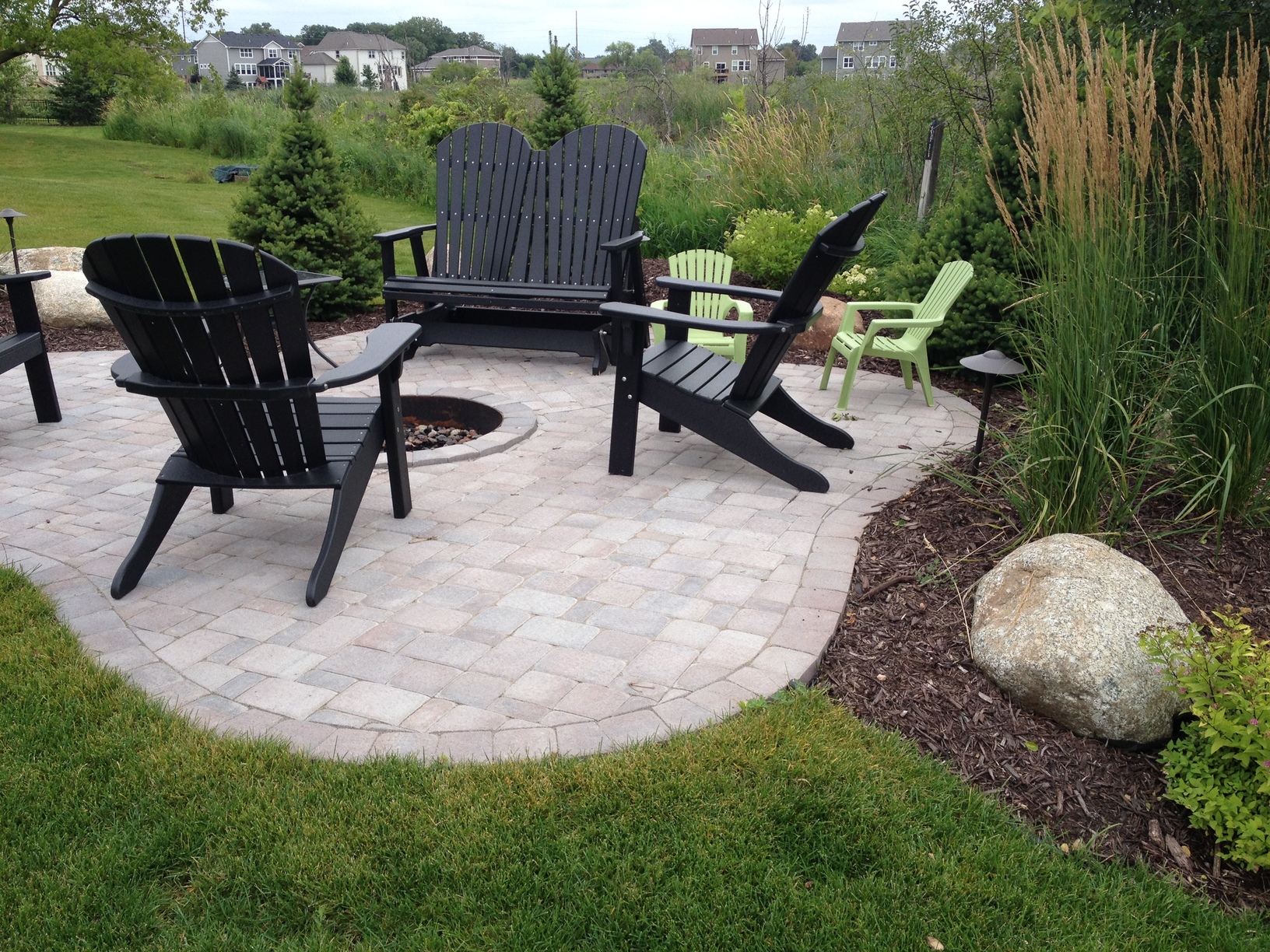 This custom landscape and hardscape project in Plymouth, MN featured a fire pit with Anchor pavers. The surrounding landscape used dark colored mulch and plant material that provides different color throughout the season and the evergreens provide some interest for all the winter fires.